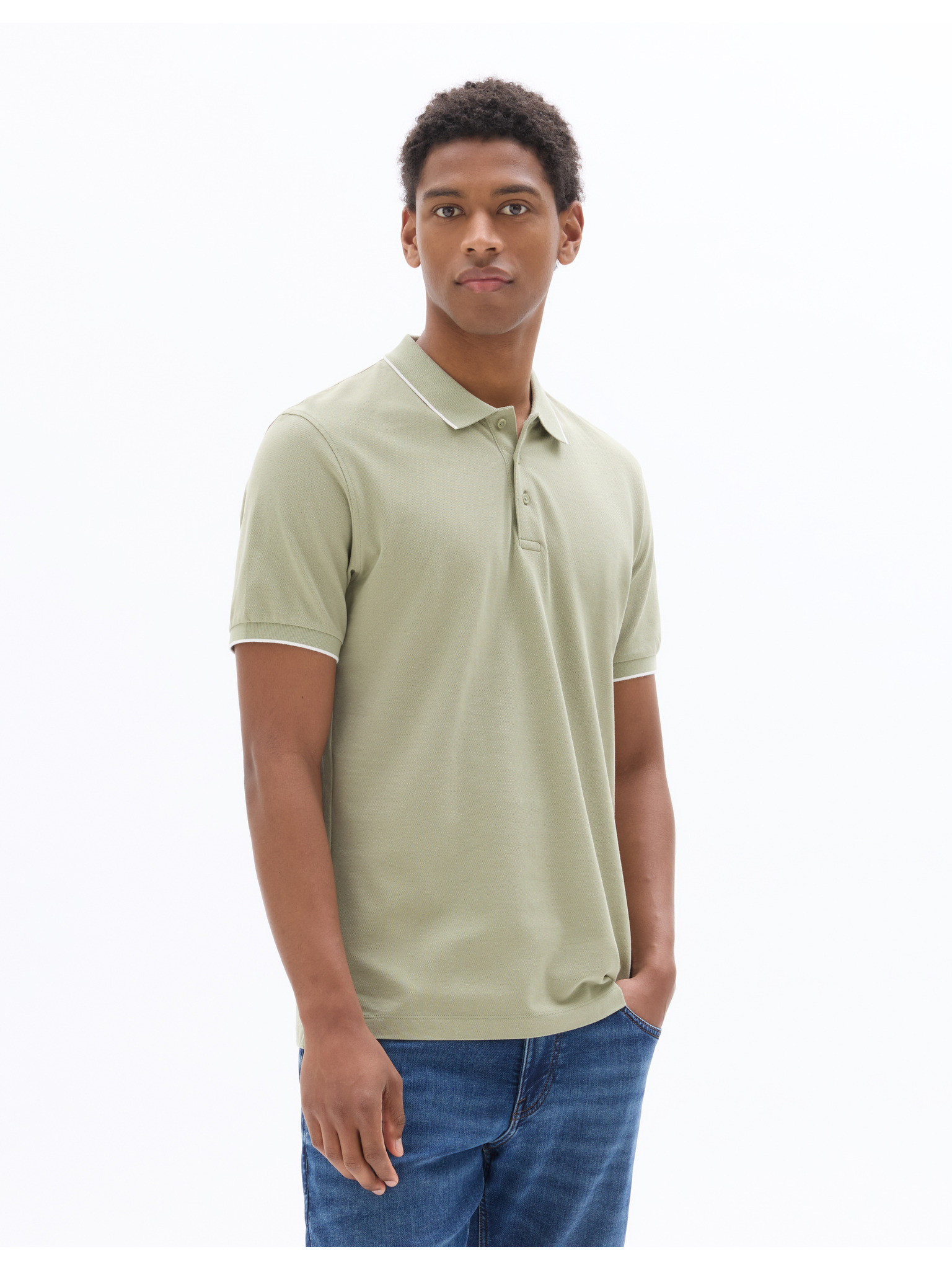 Herren Strick-Poloshirt ohne Knöpfe im Marinelook - weiß und olivgrün