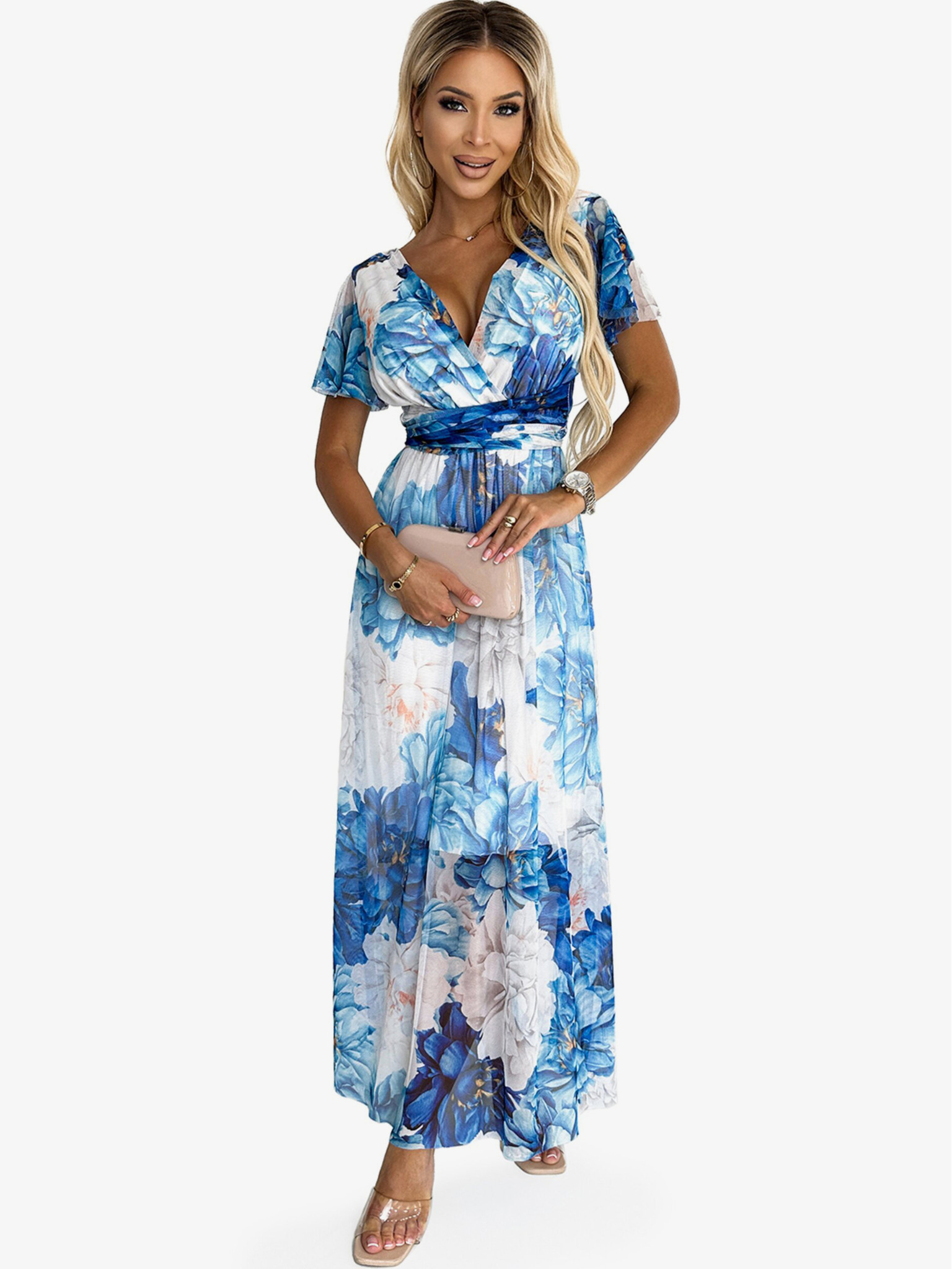 411-13 CRYSTAL Glitzerndes langes Kleid mit Ausschnitt - hellblau mit Glitzer