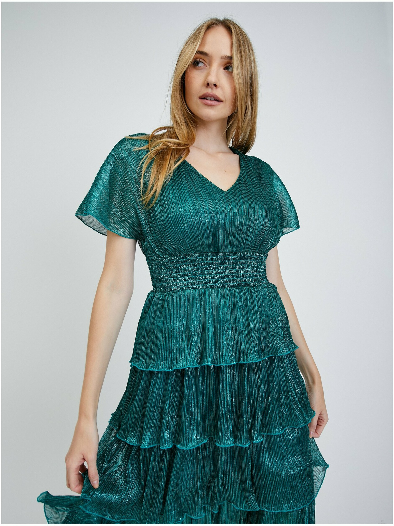 374-8 POLINA Plissiertes Kleid mit Ausschnitt und Volants - grün